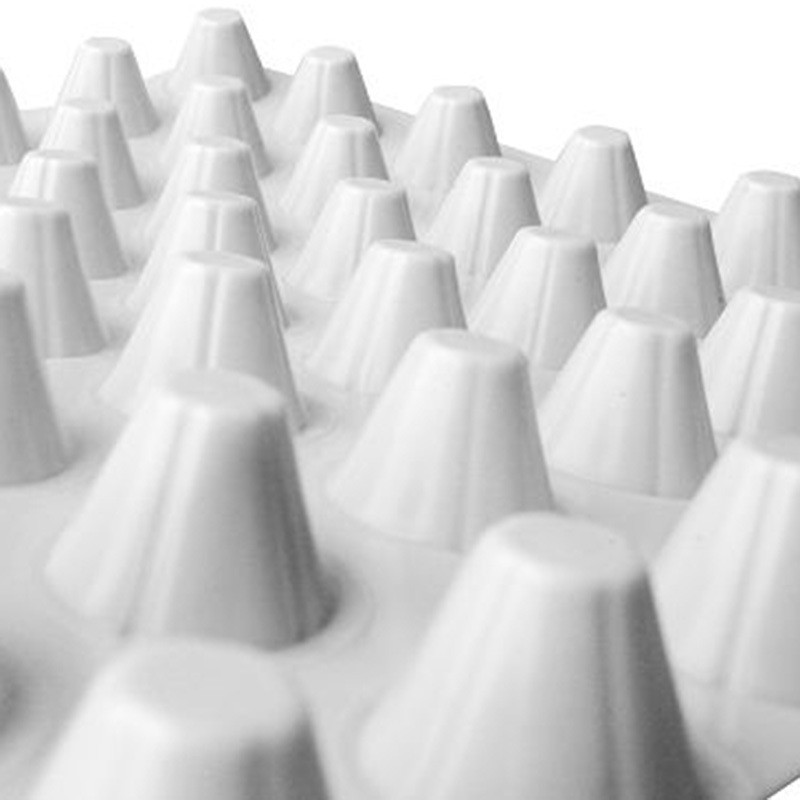 塑料排水板是由聚苯乙烯(HIPS)或者是聚乙烯(HDPE)為原料塑膠底板經(jīng)過沖壓制成圓錐突臺或者加勁肋的凸點(diǎn)(或中空圓柱形多孔)而成,經(jīng)過不斷的創(chuàng)新研發(fā)原料得到巨大提升和變更,現(xiàn)由聚氯乙烯(PVC)為原料壓制而成,抗壓強(qiáng)度和整體平整度得到大幅度的提升,幅寬有1~3米,長度有4~10米或者以上。