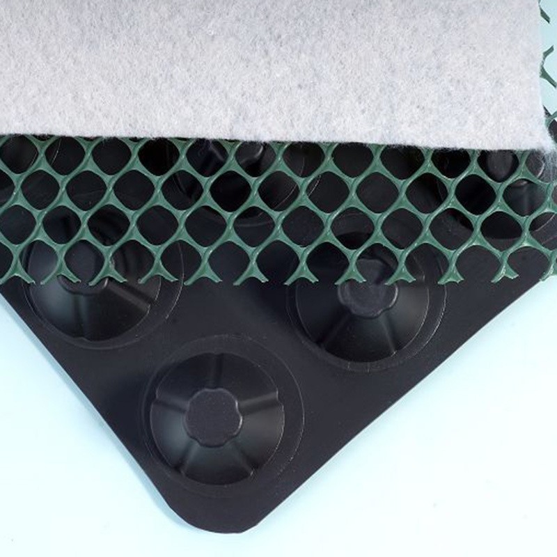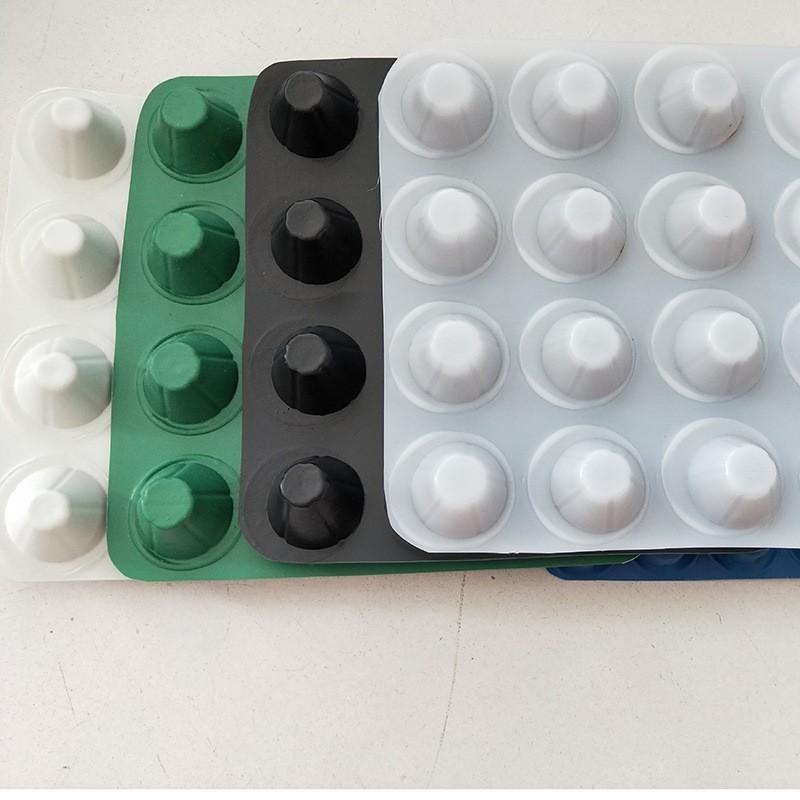 塑料排水板分卷材及片材二個系列,造型上采用特殊工藝將塑料板材壓出封閉凸起的柱狀殼體,形成凹凸?fàn)钅ぃ瑲みB續(xù),具有立體空間和一定支撐高度,邊沿加工生產(chǎn)時熱粘上丁基橡膠條,殼頂部覆蓋土工布過濾層,用于滲水、疏水、排水和蓄水的產(chǎn)品。又稱為:搭接粘膠排水板、排疏板、排水保護(hù)板、濾水板、塑料凹凸排水板、塑料夾層板。產(chǎn)品規(guī)格分為廣場綠化用和地下室用,有H20、H25規(guī)格供選用。